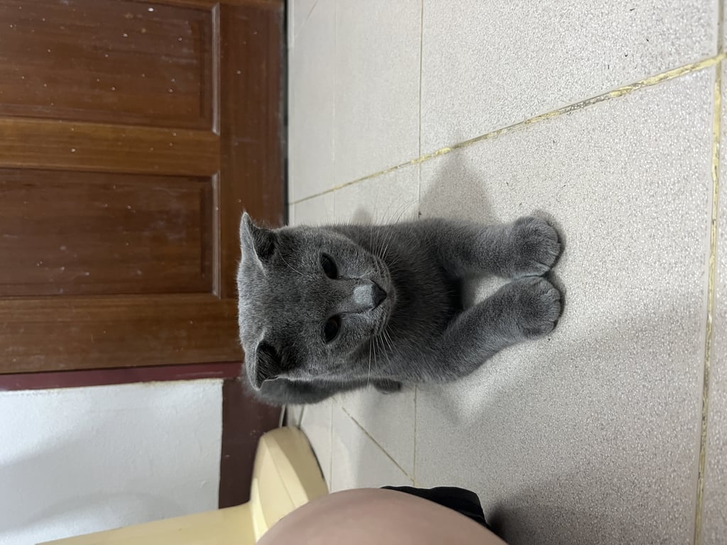 แมวโตตัวสีเทา ไม่มีปลอกคอไม่กลัวคน ขี้อ้อน หน้าตาสะอาด หูสะอาดไม่มีขี้หู มีอาการร้องติดสัตว์