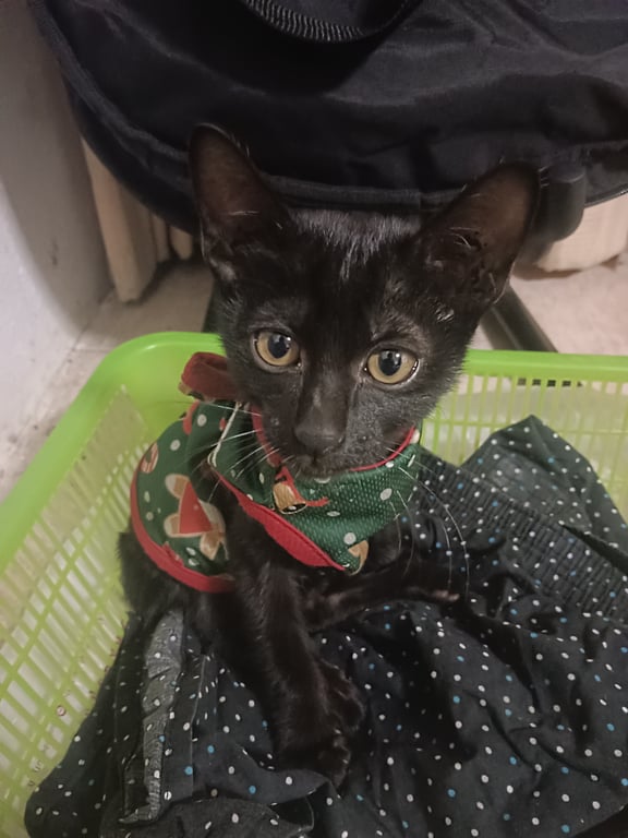 แมวตัวนี้ใส่เสื้อลายคริสมาสต์ และเจอที่หน้าเซเว่น ฟุตบาทที่ ลาดพร้าว 107 ซอย 21 ครับ แมวเจ็บขา 1 ข้าง คือขาหลังขวา และเดินได้ 3 ขาเท่านั้น