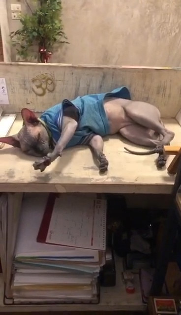 แมวเพศผู้ ทำหมันแล้ว ขี้อ้อนมาก ใส่ปลอกคอสีเขียวสะท้อนแสง กับเสื้อสีน้ำเงินเสื้อบอลลายเบอร์ 23 เข้ามาทางระเบียงสตูดิโอโยคะ สาทรซอย 8