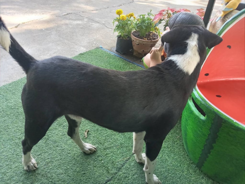 ตัวสีดำ หน้าลายขาว เท้าสี่เท้ามีสีขาวเป็นถุงเท้า ปลายหางมีลักษณะสีขาวดอกที่หาง