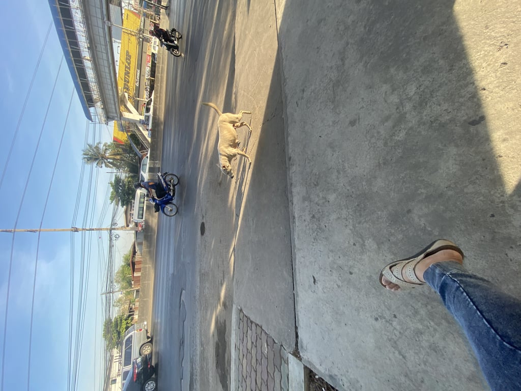 อยู่ตรงป้ายรถเมสะพานชมพู สะพานคอนโดลุมพินีรังสิต น้องกำลังเดินหากินแถววิน ไม่แน่ใจว่าน้องท้องหรือไม่