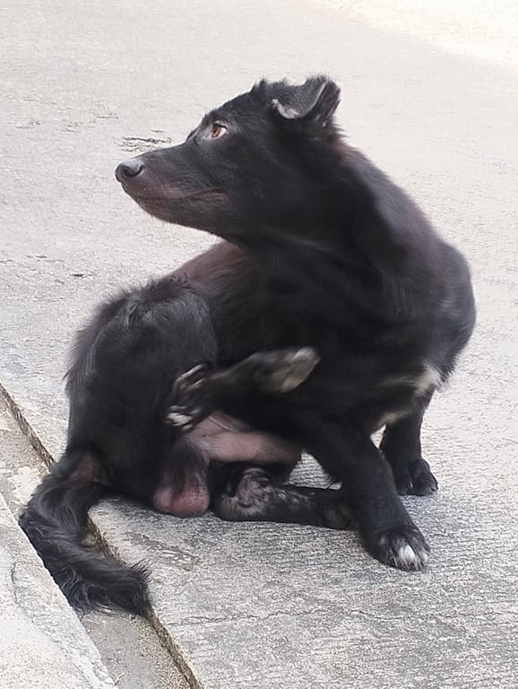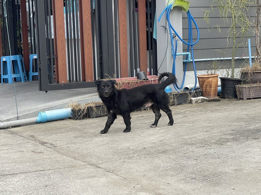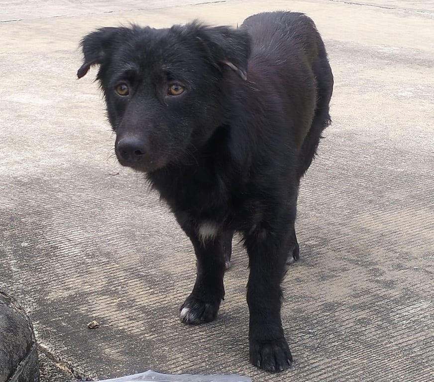 ตัวเตี้ย สีดำ เท้ามีสีขาว 3 ข้าง อกมีสีขาวนิดหน่อย ตัวไม่ใหญ่มาก หนักประมาณ 10 กิโล