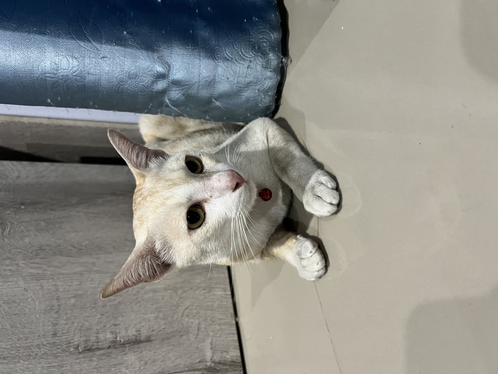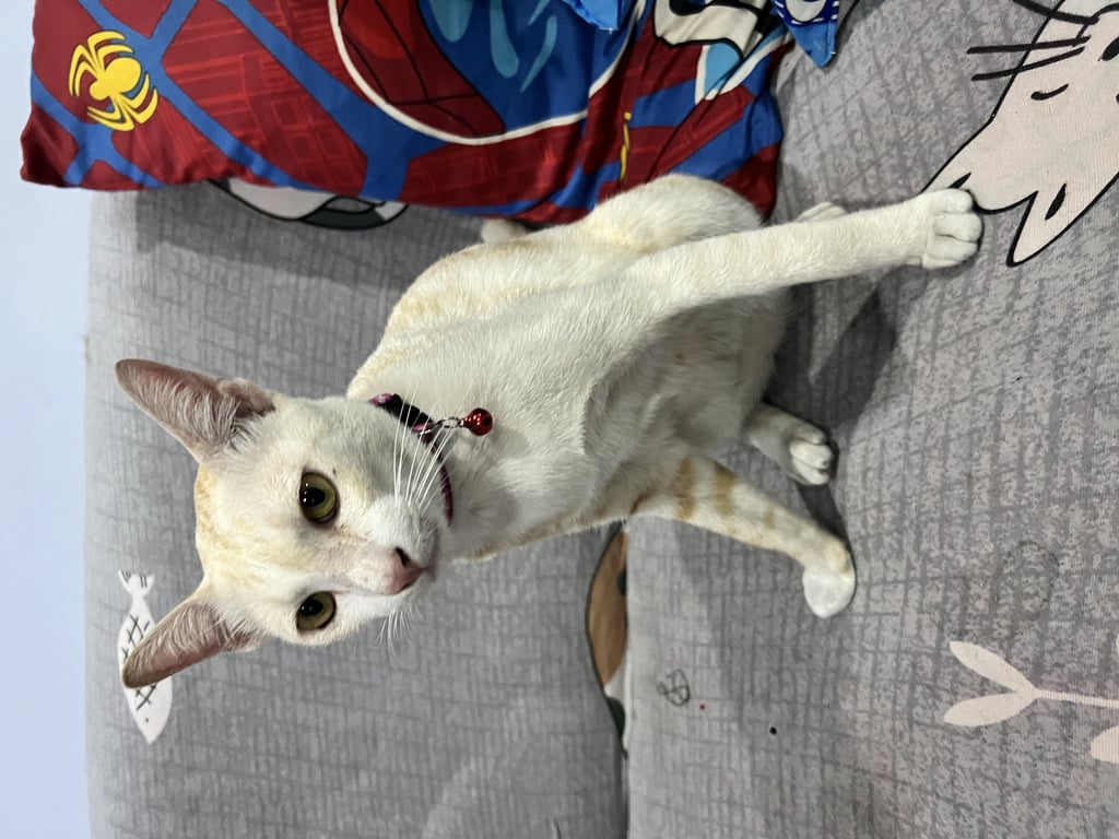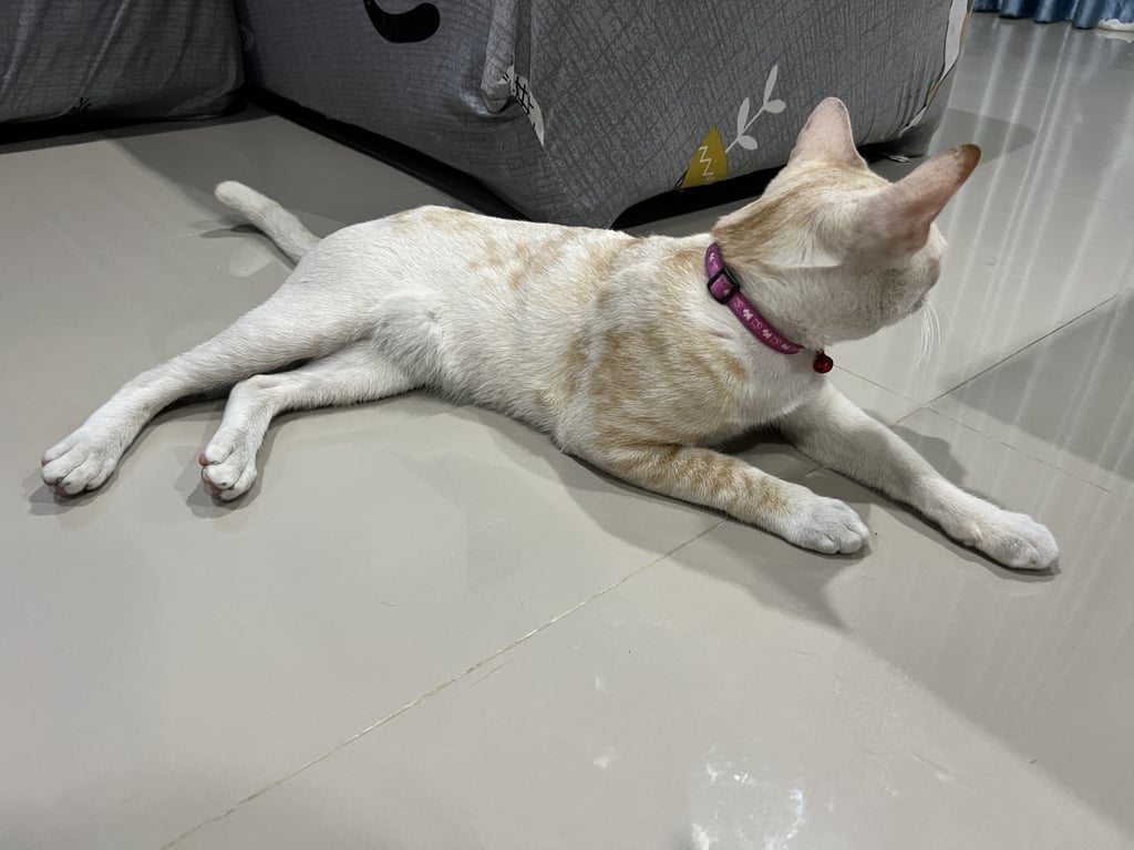 แมวเพศผู้ ทำหมันแล้ว ใส่ปลอกคอสีม่วงมีกระดิ่ง