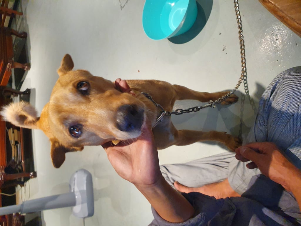 น้องหมาเพศผู้สีน้ำตาล จุดสังเกตุหางงอม้วนขึ้น หูขวามีเส้นขนสีขาวแซมๆ