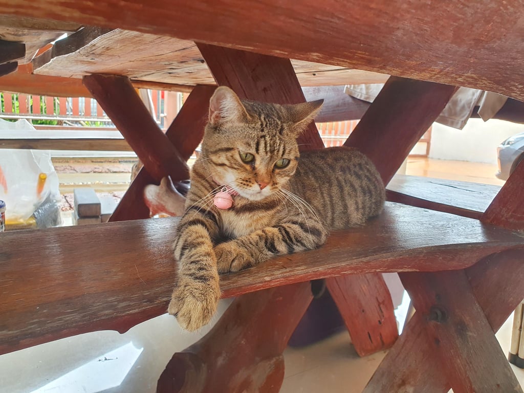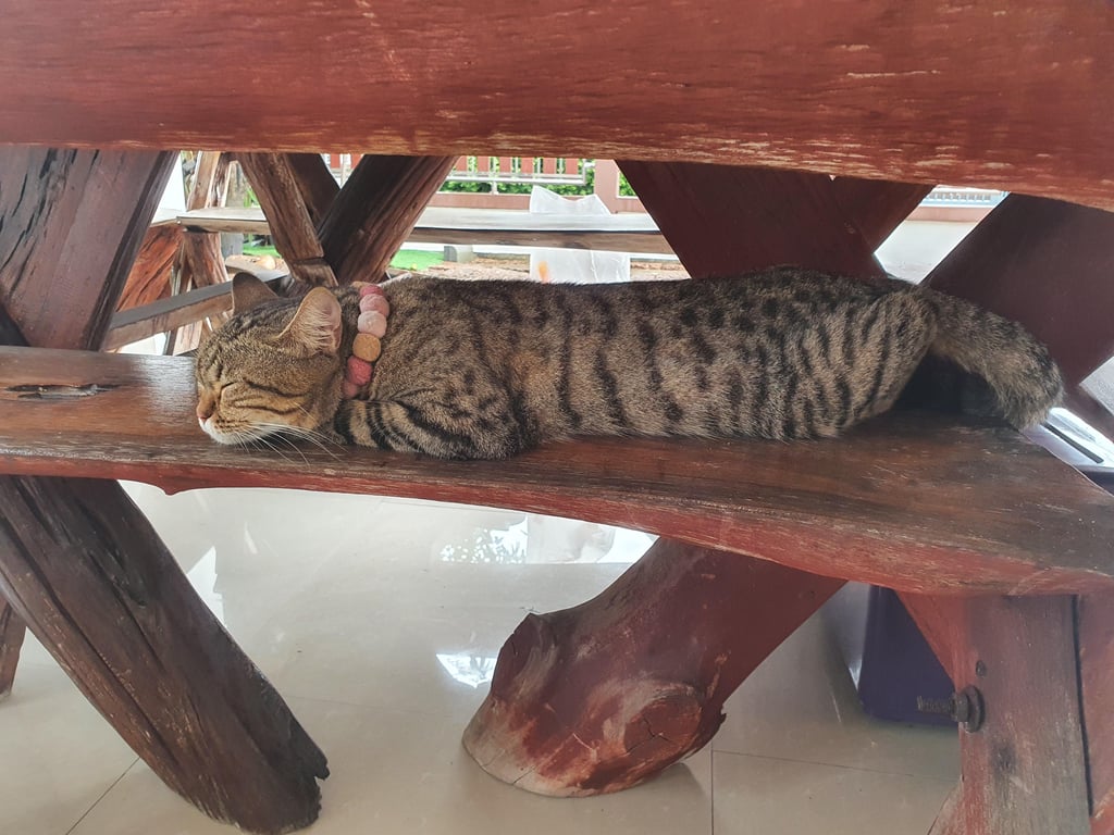 น้องเป็นแมวส้มลายดำ ที่คางกับท้องเป็นสีขาว มีปลอกคอเป็นลูกปัดหลายสี มีกระดิ่งสีชมพู