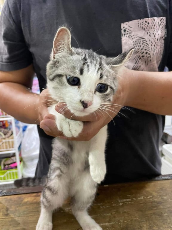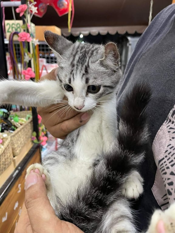 น้องแมวตัวขาวสะอาด เล็บตัดมาเรียบร้อย ตอนที่พบไม่มีปลอกคอ วิ่งเข้ามาร้านก็เล่นกับคนเลย ไม่กลัวคน ติดคน