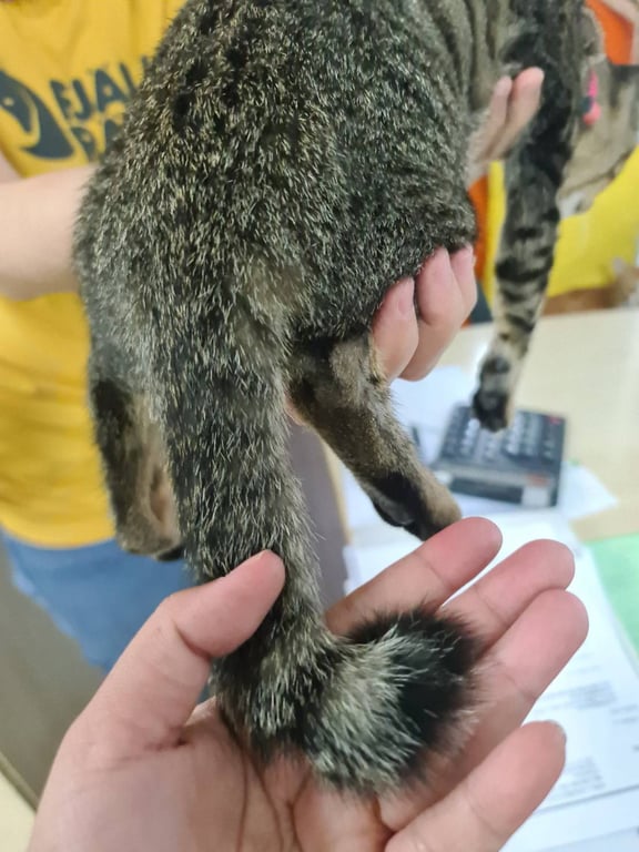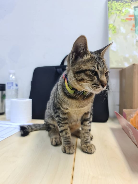 ลักษณะแมว ลายสลิด ตัวผู้ อายุ 4-5 เดือน หางขอดเล็กน้อย พบที่พระราม 9 ซอย 53 คาดว่าน่าจะหลงมาตั้งแต่วันที่ 13 มีนา