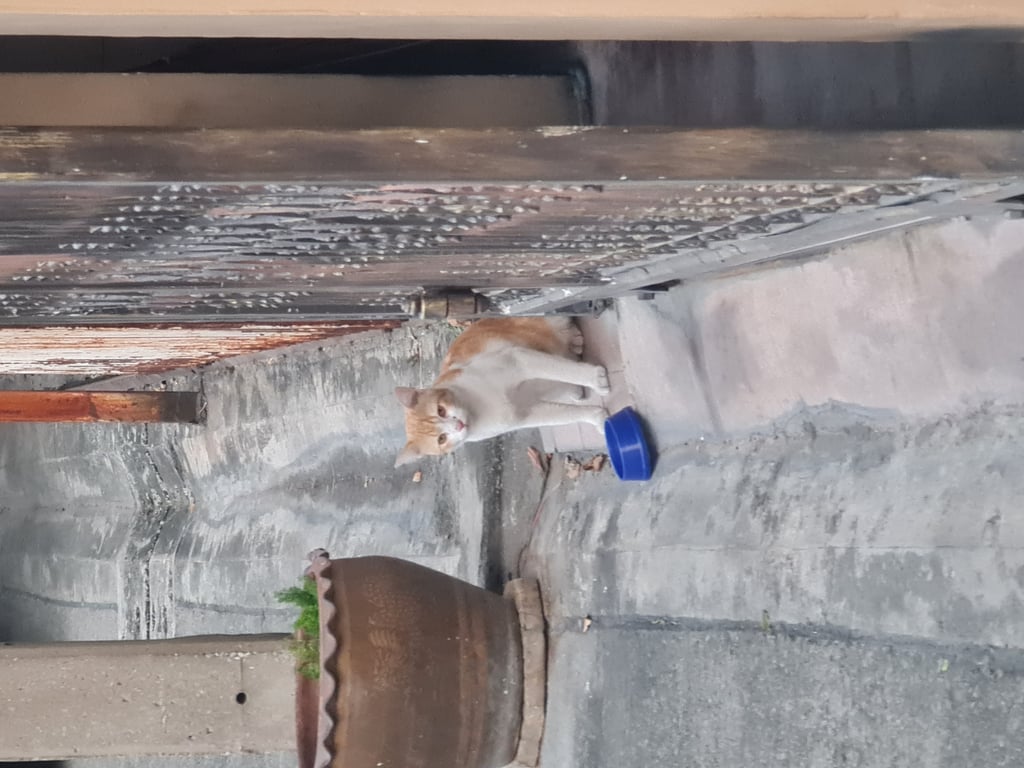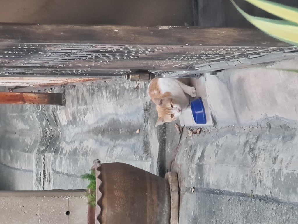 ตอนแรกที่มากินข้าว น้องมีปลอกคอน่าจะสีเขียว มีกระพรวนเสียงดัง แต่ตอนหลังปลอกคอหลุดหายไปแล้ว สีส้มขาว หางสั้นเหมือนหางกุด