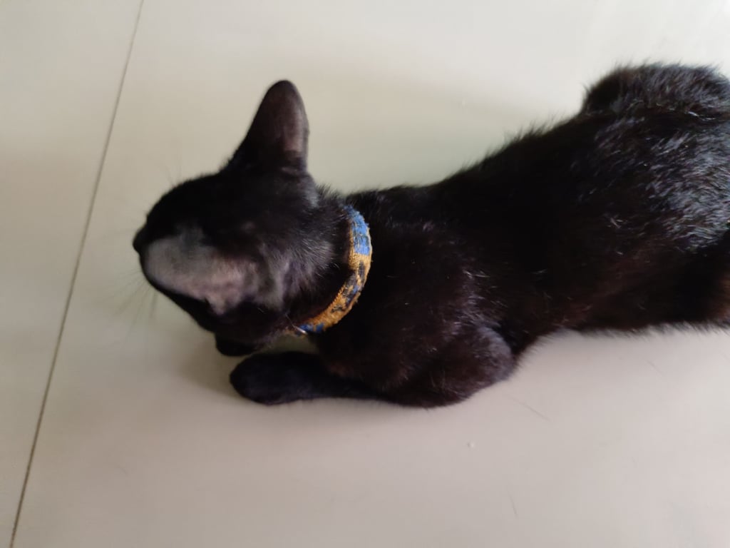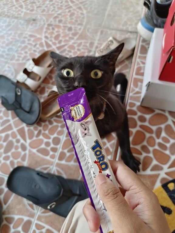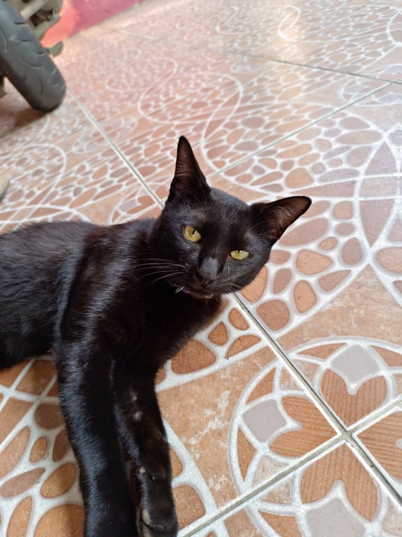แมวดำตัวผู้ยังไม่ทำหมัน ขี้อ้อน หลงมาขอหลบอยู่ที่บ้าน ตาสีเหลือง หางยาวไม่มาก ชอบเล่น