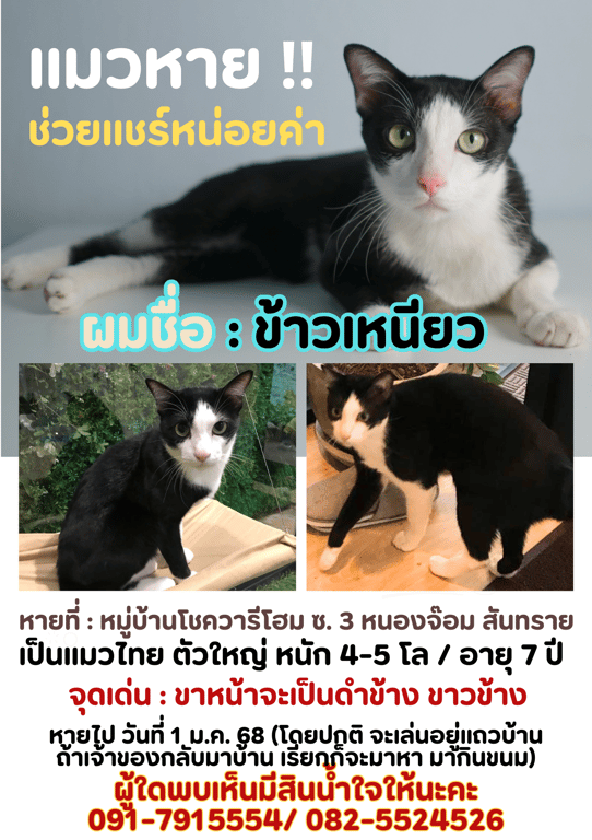 ปกติ จะให้น้องเล่นในบริเวณบ้าน ตอนเช้า และตอนเย็นเลี้ยงเข้าห้อวแมว ปกติเรียกก็จะมา / คืนวันที่ 1 เจ้าของกลับมาดึกหน่อย พอกลับมา เรียกเพื่อนๆเค้า ตัวอื่นอยู่ครบ มีแค่ข้าวเหนียวที่หายไป ตามหาซอยใกล้ๆ ยังไม่พบ