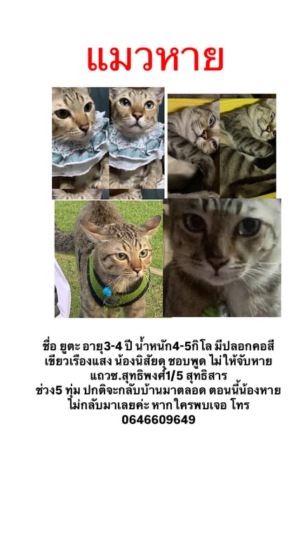 ปกติยูตะจะกลับมาบ้านมาตลอด แต่อยู่ๆเกิดเหตุการ์ณผิดปกติ หายไป2วันแล้วค่ะ เขาเดินออกจากบ้านปกติ ตรงปลอกคอเป็นสีเขียวเหลืองแสง