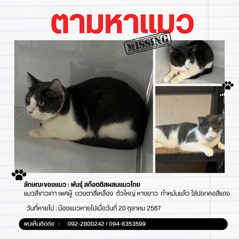 เจอแมวจรไล่กัด วิ่งหนีหาย ไปเลยค่ะ ใครพบเจอ ติดต่อมาเลยค่ะ