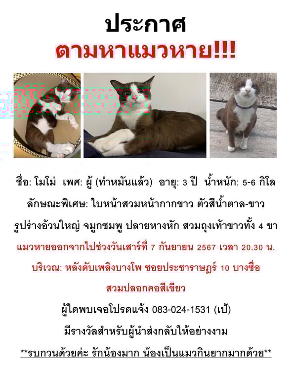 หายที่ซอยสุขเกษม 5 เชียงใหม่ อยู่ในซอยโรงพยาบาลลานนาเชียงใหม่ค่ะ น้องตกใจเลยหลุดออกจากบ้านไป ตามหาไม่เจอ เรียกก็ไม่ตอบ หลุดหายตอนน้ำเริ่มท่วมค่ะ ตอนนี้ในหมู่บ้านท่วมถึงหน้าอกแล้วยังตามหาไม่เจอ