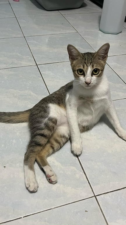 น้องน่าจะถูกเพื่อนแมวตัวอื่นต้อนจนพลักตกจากบ้าน จุดสังเกตน้องคือ ตัวน้องจะมีขาที่หักอยู่ข้างนึง เวลาเดินจะกะเผลกๆค่า