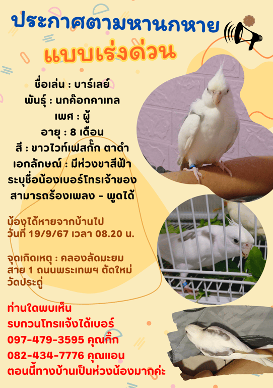 เปิดประตูบ้านซึ่งปกติน้องไม่เคยบินออกไปแต่ในวันนั้นมีนกตัวนึงที่บิน น้องซูกัสเลยบินตามออกไป ซึ่งหายไปตั้งแต่วันที่ 13 กันยายน 2567เวลา 06.30 น. ตอนนี้ก็ยังหาไม่เจอ หมู่บ้านThe connect เพชรเกษม 69 ซ.2/4 ถ.เพชรเกษม แขวงหนองแขม เขตหนองแขม กรุงเทพฯ 10160