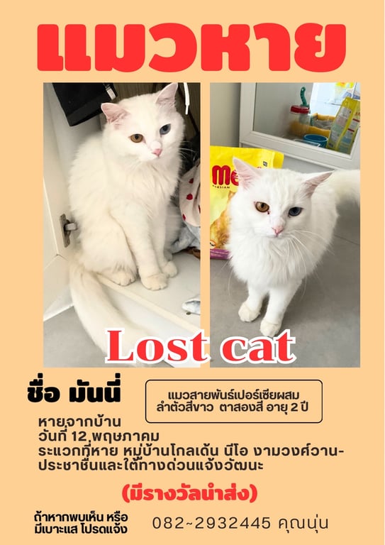 ลงประกาศตามหาในเพจเฟสบุ๊ก และมีคนใจดีติดต่อพร้อมส่งภาพและบอกสถานที่เจอว่าอยู่แถววัดปากคลองพระอุดม ปากเกร็ด จึงได้ตามไปดูและพบว่าเป็นเจ้าทองจริงๆ ตอนนี้ได้นำน้องกลับมาถึงบ้านเรียบร้อยแล้ว