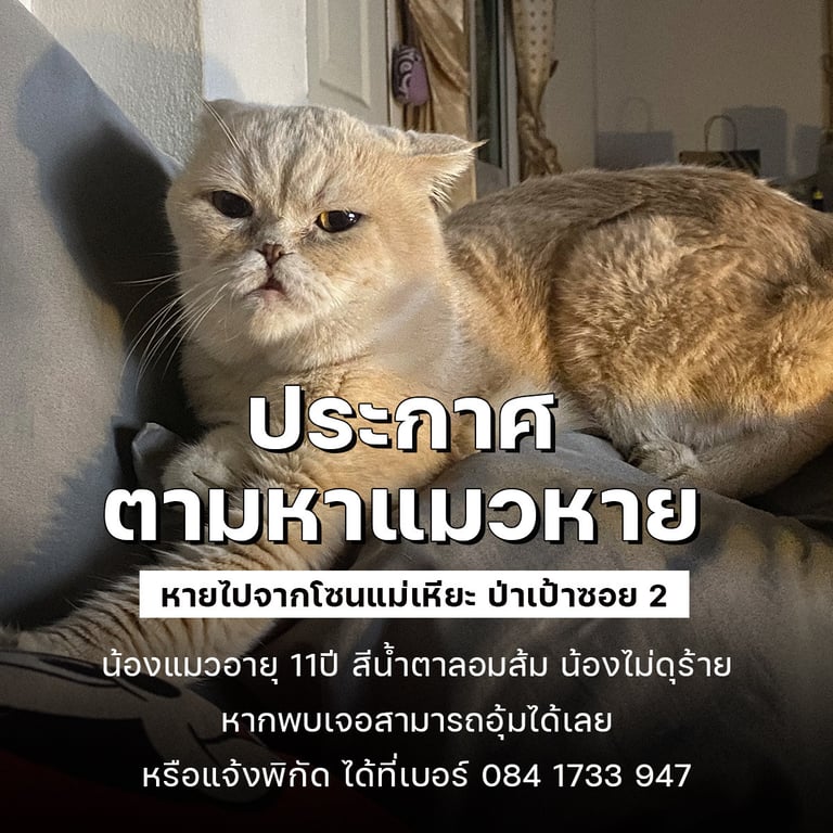 น้องหลุดออกไปตอนปิดประตูบ้าน ข้างบ้านแจ้งว่าเห็นน้องนั่งรออยู่หน้าบ้านพยายามช่วยกันจับเอาไว้ที่บ้านแต่จับไม่ได้ น้องไม่ยอมให้โดนตัวแล้วน้องตกใจวิ่งหนีออกไปและบริเวณรอบข้างมีหมาและมีแมวที่ไม่ชอบน้อง และเจ้าของกลัวว่าจะมีคนอุ้มน้องไปด้วยเช่นกัน