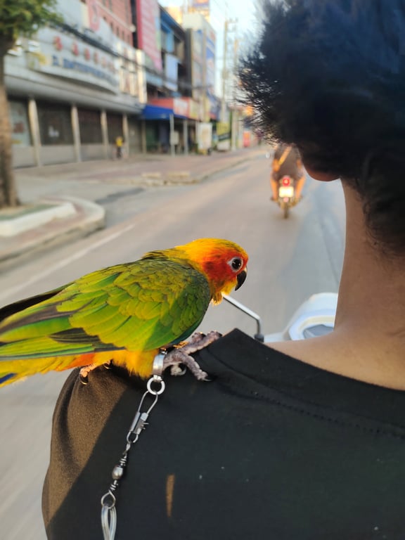 น้องค่อนข้างกลัวเวลาจะจับแต่ชอบบินมาเกาะไหล่มาเล่นด้วยแต่ไม่ค่อยให้จับ