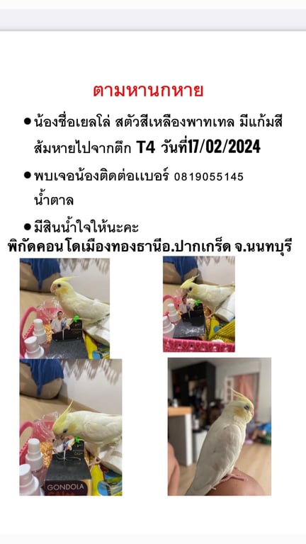 น้องหลุดจากคลินิกที่รับฝากสัตว์เลี้ยงและหนีเตลิดไปหมู่บ้านภัสสร เพลสทีจ พัฒนาการ 38 หากพบเห็นสามารถติดต่อคุณไมค์เจ้าของ หรือคุณโน่ จากทางคลินิก ผู้รับผิดชอบเงินรางวัล