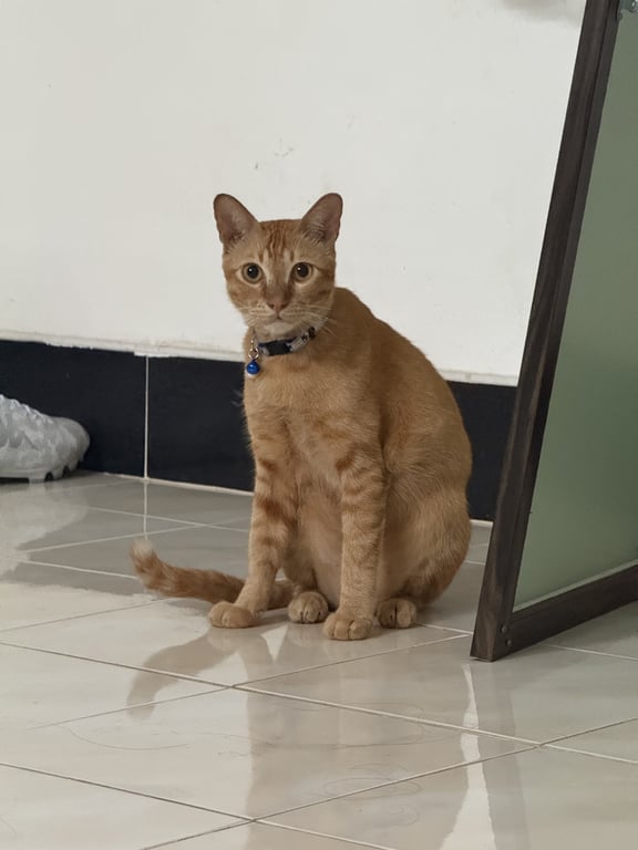 ลางานไปบนศาลเจ้าพ่อเสือมา แวะกลับเข้ามาที่บ้าน คนแถวบ้านบอกเห็นแมวลักษณะเดียวกัน บริเวณซอย2 (บ้านเราอยู่ซอย 1) เลยเดินไปหาไปเรียก สักพักได้ยินเสียงตอบมาจากบ้านร้าง ในใต้ถุนมีแต่น้ำเลยเดินลุยน้ำเข้าไปหา เจอน้องแอบอยู่ข้างในสุดของบ้านร้าง