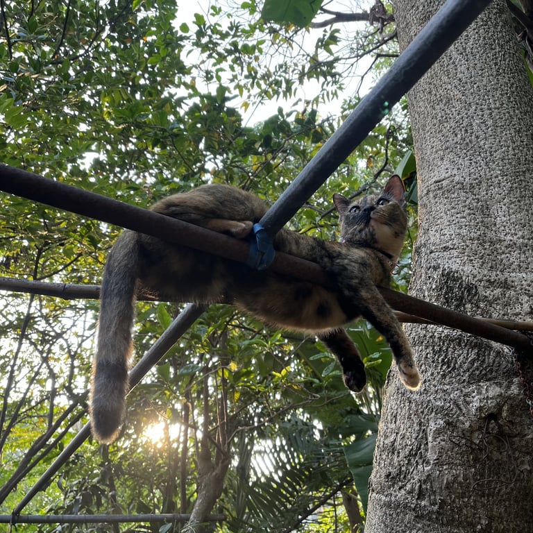ตรวจวงจรปิดในหมู่บ้าน ไปพบที่บ้านด้านหลัง ที่แปลนบ้านคล้ายกัน แมวน่าจะจำแปลนบ้านได้ แต่หลงซอย แล้วไปนอนหลบอยู่