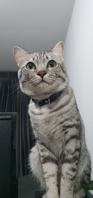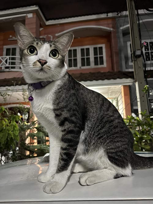 แอบเปิดหน้าต่างออกมาเอง ไม่ได้ใส่ปลอกคอ ลักษณะหางกุด มีรอยแผลตรงหัวคิ้วขวา ขี้ตกใจ วิ่งไวมาก