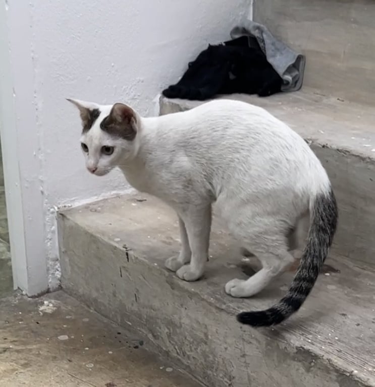 แมวสีขาว มีขนสีเทาแซมกลางหัว เพศผู้ พันธุ์สก็อตติช ตื่นคน กลัวเสียงดัง เลี้ยงในบ้านระบบปิด น้องไม่เคยวิ่งออกจากบ้านเลย แต่คาดว่าเริ่มติดสัตว์เนื่องจากมีการร้องเสียงดังเมื่อคืน ทั้งๆที่ไม่เคยร้องมาก่อน