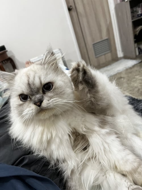 ขนยาวสีขาว มีสังกะตังบริเวณคอ ขี้กลัว ชอบหลบ