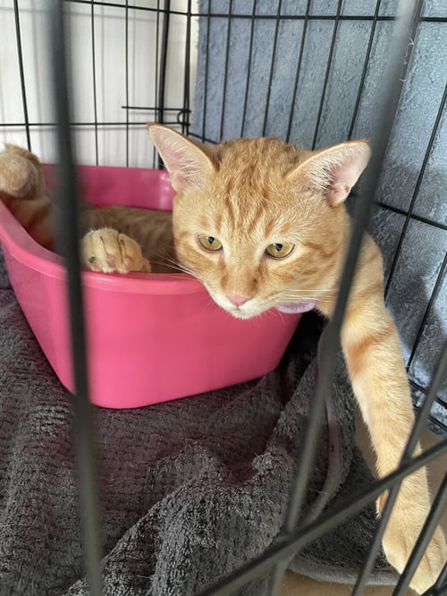 ล็อคกรงไม่สนิทเลยอาจจะเอาหัวดันออกมา ชอบกินอาหารมากน่าจะหิวด้วยเอาข้าวล่อได้นะคะ ตัวสีส้มหางยาวหงิกปลาย หน้ากลมๆตาเศร้าๆ