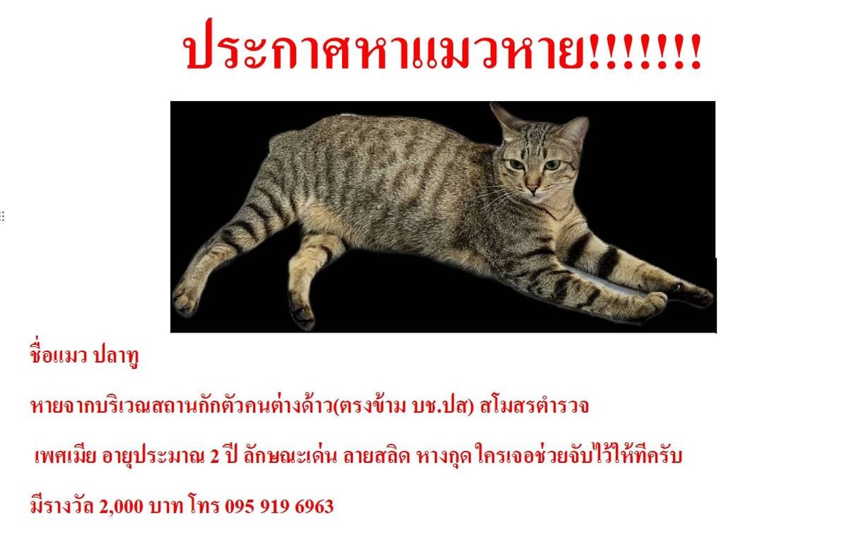 มีชาวบ้านพบเห็นบริเวณแถวๆหน้าปากซอยบ้าน เลยอุ้มมาถามคืนที่บ้าน ว่าใช่แมวตัวที่ตามหาไหม สรุปว่าใช่น้องจริงๆค่ะ ขอบคุณมากเลยนะคะ