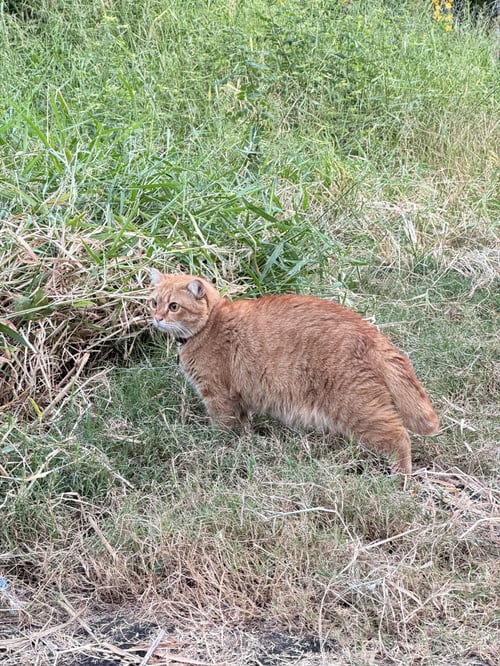 ส้มมาจากสุพรรณบุรีค่ะ กัดกับแมวเจ้าถิ่น ตอนแรกเอาเข้าบ้านแล้วแต่น้องก็มุดรั้วออกไปอีกค่ะ