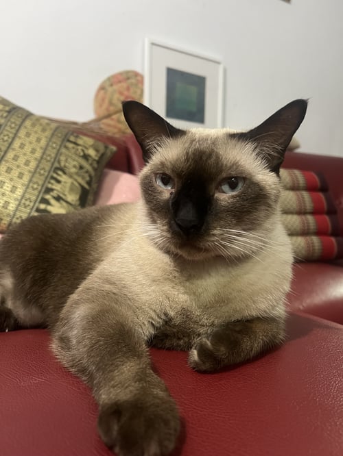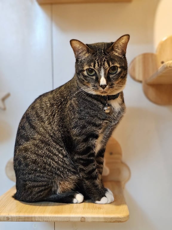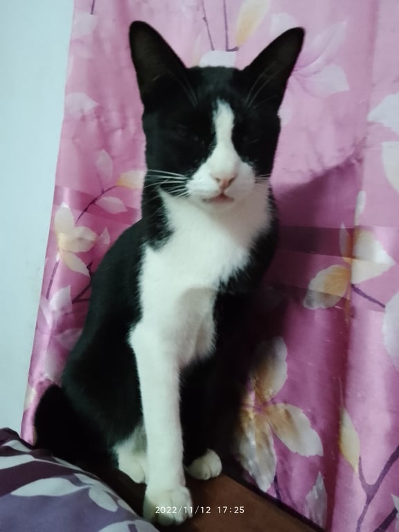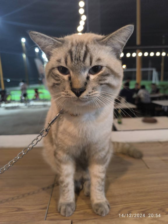 น้องเป็นสีขาว ตาสีเหลืองชัดเจน ปลายหางน้องหักงอเล็กน้อย ปลอกคอสัเขียวมีกระดิ่งค่ะ