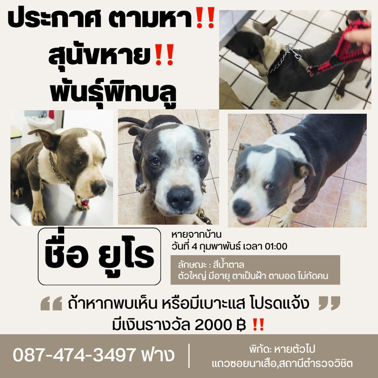 สวัสดีค่ะ🙏 อัพเดตวันนี้‼️ เจอตัวแล้วค่ะ‼️😊เจอตัวแล้วค่ะ‼️😊เจอตัวแล้วค่ะ‼️😊 วันที่6กุมพาพันธ์2568ค่ะ ---------------------------------------------- ตอนนี้ หมาอยู่ที่ มูลนิธิซอยด็อกไม้ขาว จ.ภูเก็ต นะค่ะ เมื่อกี้ ได้ขับรถไปหาที่ มูลนิธิ เรียบร้อยค่ะ และ ทางมูลนิธิที่ซอยด็อก แจ้ง ว่า จะนำมาส่ง ให้ที่บ้าน ในวันพรุ่งนี้ ค่ะ เพราะตอนนี้อยู่ในช่วงของการดูแล สุนัข ที่นั้นอยู่ค่ะ ---------------------------------------------- ซึ่ง หนู ได้ติดต่อคุณจิมมี่ เค้าเป็นฝรั่งใจดี เค้าเป็นคนเจอสุนัข ของหนู โดยตรง หนูได้ติดต่อไปเป็นที่เรียบร้อยแล้วค่ะ และ ภรรยาของคุณจิมมี่ เค้า ได้ นำสุนัข ของหนูไปส่ง ทางมูลนิธิซอยด็อกเองกับมือเป็นที่เรียบร้อยค่ะ หนูได้ ติดต่อโทรคุย ประสานแล้วนะค่ะ **ขอขอบคุณทุกกำลังใจ และ ขอบคุณทุกคน ที่ช่วยกันแชร์ ภาพ มากๆคะ 🙏🥹❤️** ---------------------------------------------- ตอนนี้หนูได้ซื้อเครื่องติดตามGPS-Air Tag ติดสัตว์เลี้ยงไว้เรียบร้อย แล้วค่ะ ขอขอบคุณมากๆค่ะ รอบนี้จะไม่ให้หลุด ไปไหนแล้วค่ะ ขอบคุณสำหรับความห่วงใย ให้กับน้องยูโร ค่ะ🙏🥹
