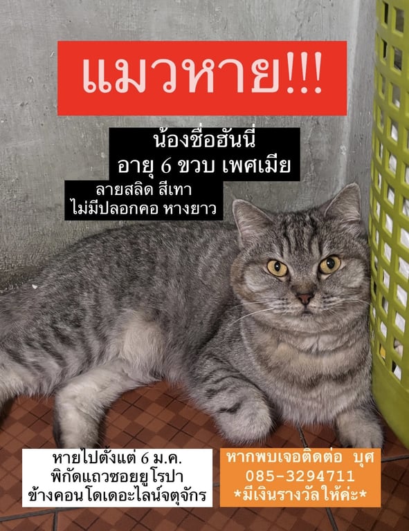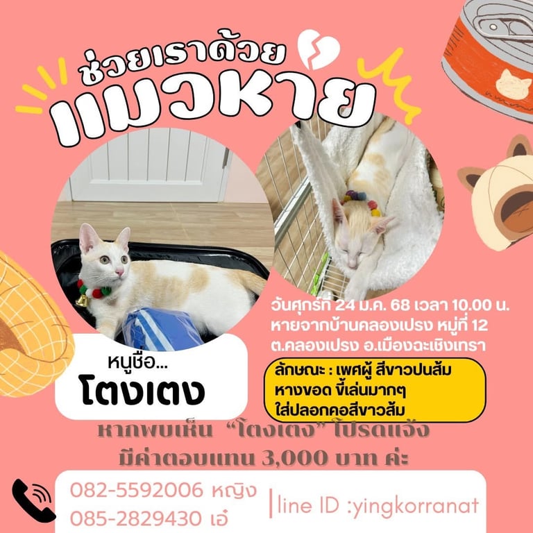 หายออกจากบ้านวันที่26 มกราคม 2568 มีห่วงขาสีส้ม ข้างซ้าย เชื่อง