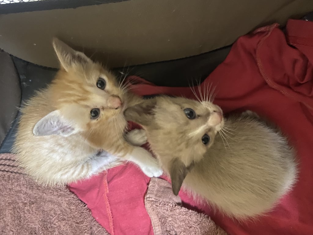 น้องเป็นลูกแมว น่าจะประมาณ 1 เดือน แมวเราไปคาบมาจากไหนไม่รู้ค่ะ ตัวแรกที่คาบมาเราไม่ทันรู้ตัว เห็นอีกทีก็โผล่มาอยู่ในบ้านแล้ว ส่วนตัวที่สองเราเห็นตอนเขากำลังคาบมาเลยค่ะ เลยได้รู้มาน้องมาได้ยังไง