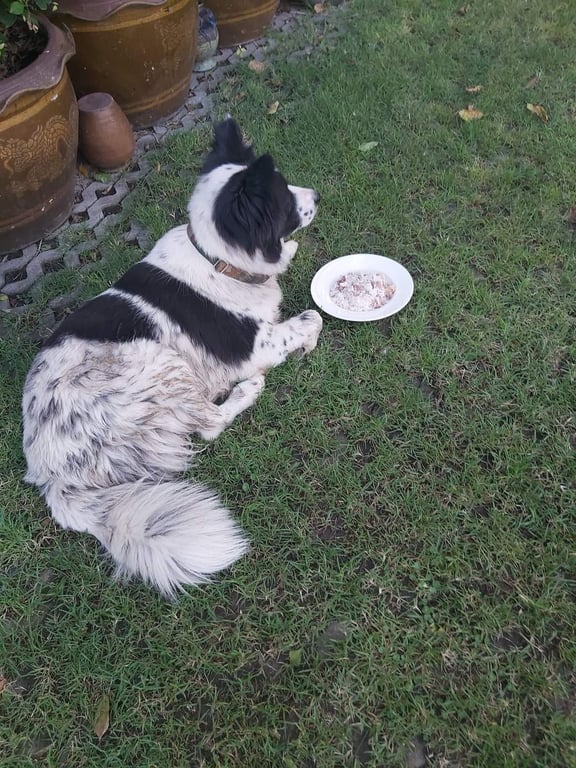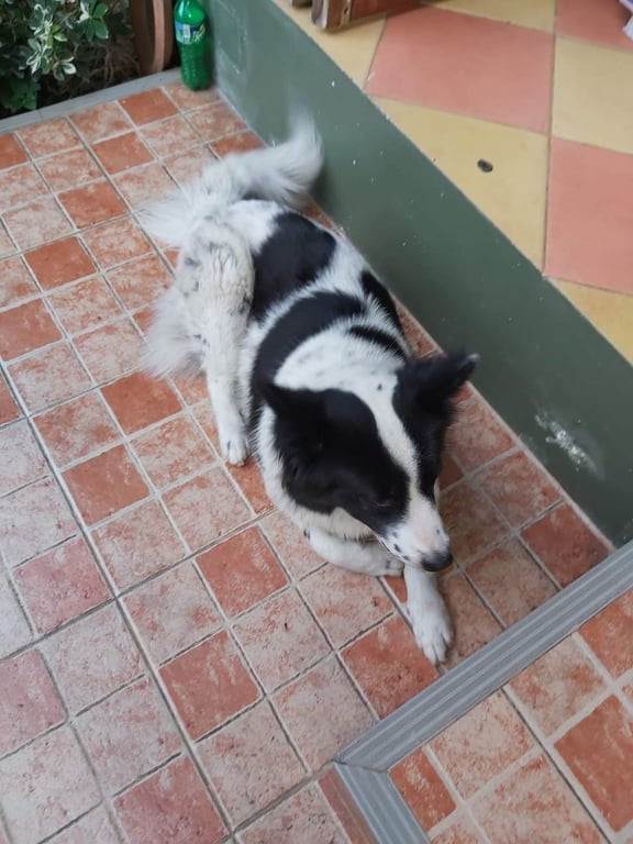 น้องขนยาว สีขาว ด่างสีดำ หู 2 ข้างเป็นสีดำ ตรงกลางหน้า จมูกเป็นสีขาว