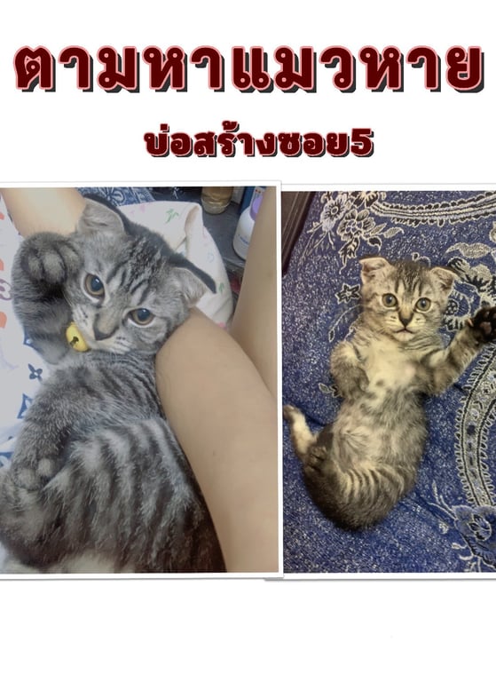 รอยตำหนิ: พันธุ์สก๊อตติชโฟล์ด หูพับ สร้อยคอม่วงกระดิ่งเหลืองชื่อยอน พันธุ์สก๊อตติชโฟล์ด หูพับ กระดิ่งที่คอสีเหลือง ลายสลิด