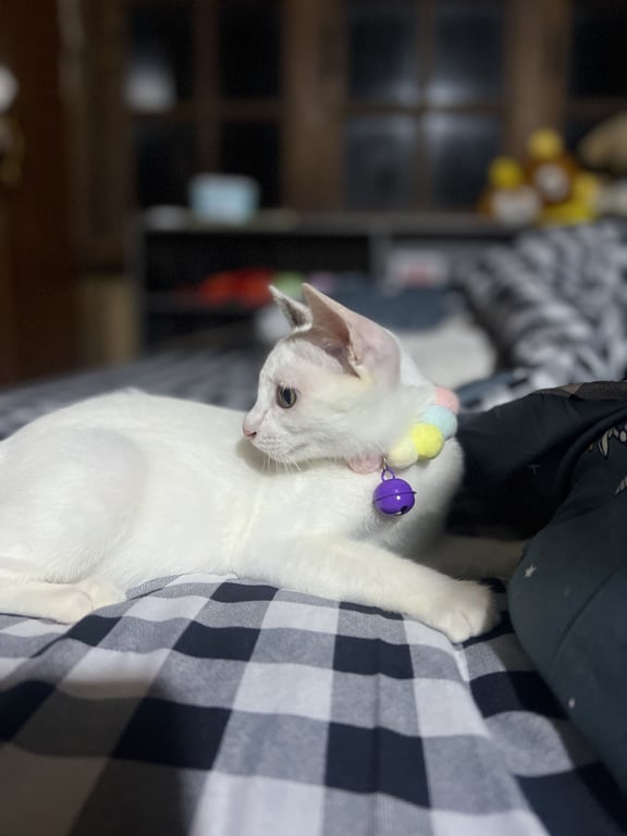 รอยตำหนิ: ตัวขาว หางดำ หูขวามีแต้มดำอ่อนๆ