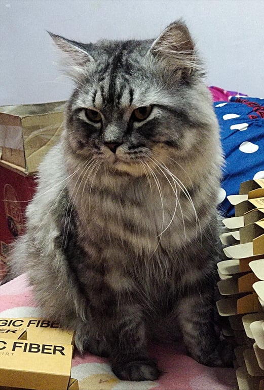 รอยตำหนิ: หน้าผากมีรูปตัวMตัวอ้วนขนยาวหางฟูหนัก7กิโลไม่ดุแต่ขี้กลัวตัวอ้วนขนฟูสีเทาสลับขาว