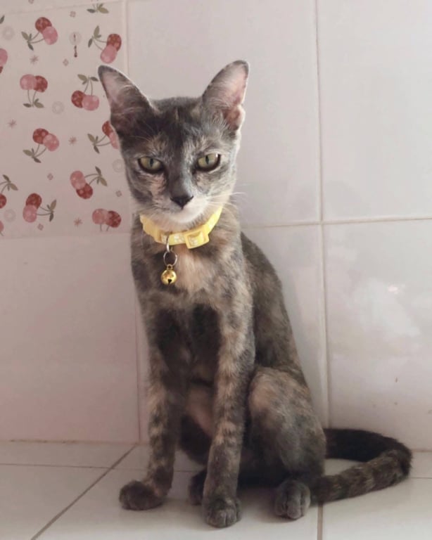 รอยตำหนิ: สีเปรอะ 3 สี ตัวบางผอม หน้าเล็กๆ หางยาว ปลอกคอสีส้มสะท้อนแสง หรือปลอกคอไม่มีเพราะน้องอาจทำหายขี้สงสัย ขี้เล่น เเละกลัวคนแปลกหน้า