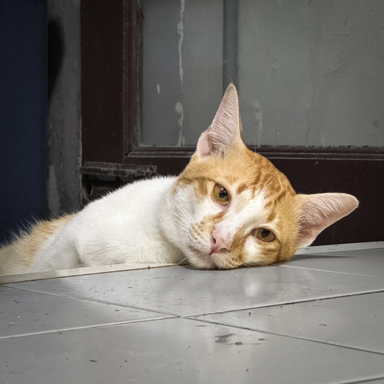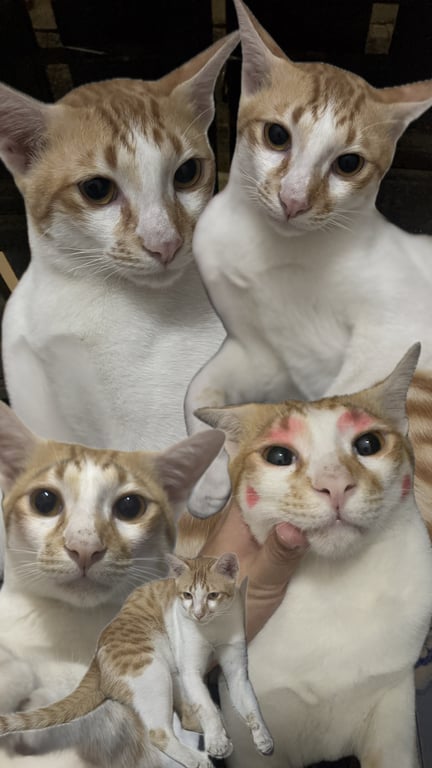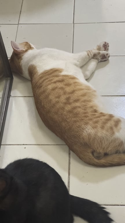 รอยตำหนิ: ปลายหางหากลองลูบดูมีความคดเล็กน้อยปลอกคอสีเขียว ช่วงขาขาวเเต่มีข้อศอกส้มขาหน้าข้างซ้าย(ซ้ายเเมว) ตัวใหญ่เเต่ไม่อ้วน
