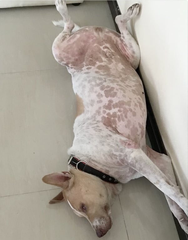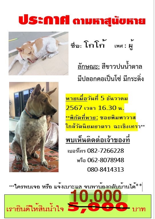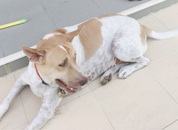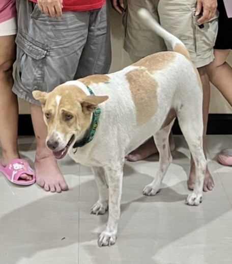 รอยตำหนิ: หน้าผากลายขาวตรงหางมีปานดำ และขนน้อย หลายจุดๆน้ำตาลคอ และ ท้องมีปลอกคอขายโซ่ผูกกระดิ่งทอง เป็นหมาที่ขี้กลัว กลัวเสียงประทัด ชอบไปซ่อนเวลากลัว ใจดี แต่ถ้าเห่า เรียกชื่อเค้าจะหยุดเห่า เลี้ยงแบบอยู่บริเวณบ้าน มีรั้วและในบ้าน