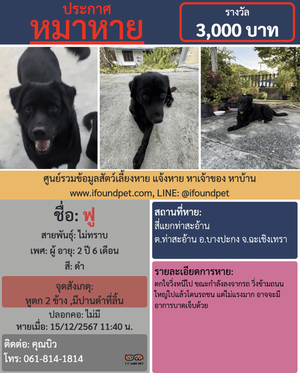 รอยตำหนิ: หูตก 2 ข้าง ,มีปานดำที่ลิ้นหมาสีดำ ตัวใหญ่ หูตก 2 ข้าง มีปานดำที่ลิ้น