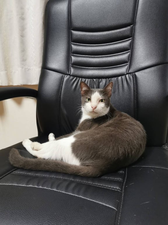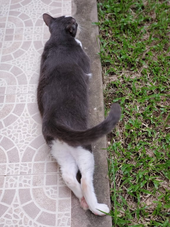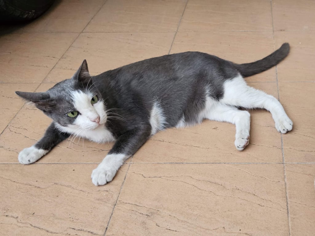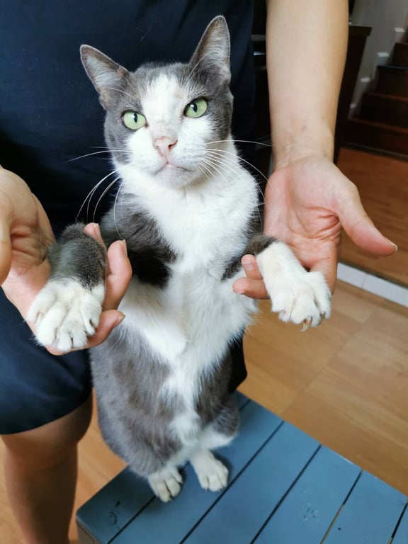 รอยตำหนิ: ท้องขาว เท้าขาว หางยาวสีเทาแมวเพศผู้ สีเทาเข้ม/ขาว หางยาว ปกติคุ้นคน แต่กลัวเด็ก