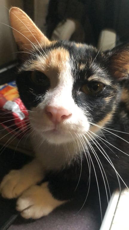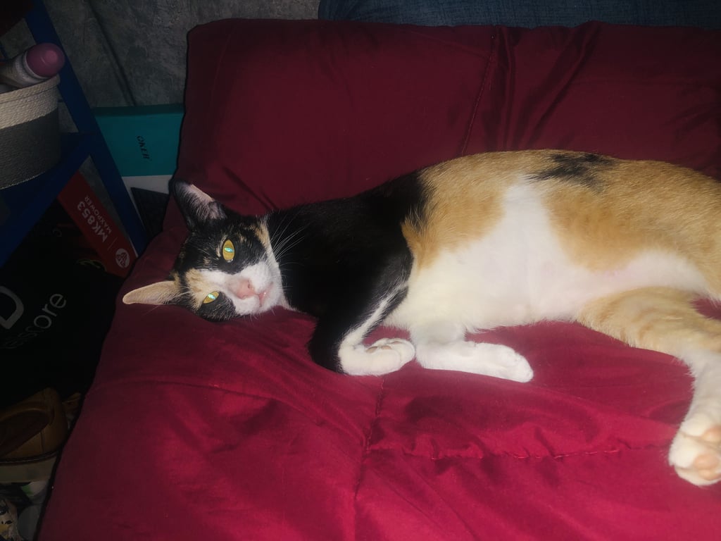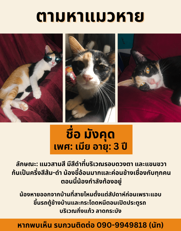 รอยตำหนิ: ขนที่แขนขวาเป็นสีดำเกือบทั้งแขนขี้อ้อนมากๆ เชื่องกับทุกคน และน้องกำลังตั้งท้องอยู่ค่ะ