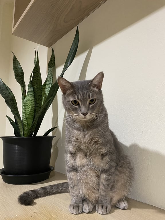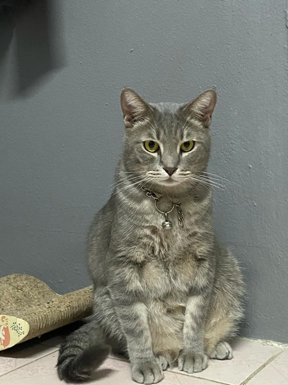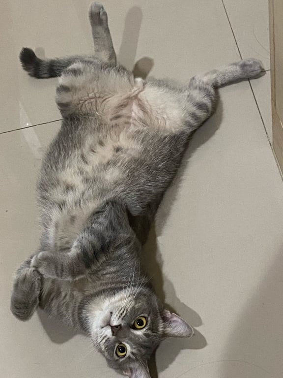 รอยตำหนิ: น้องจะพุงห้อยๆน้องแมวตัวใหญ่ๆมีปลอกคอเป็นโซ่สีเงิน น้ำหนักประมาณ6กิโลตัวสีเทาพุงย้อยๆนิสัยขี้กลัว