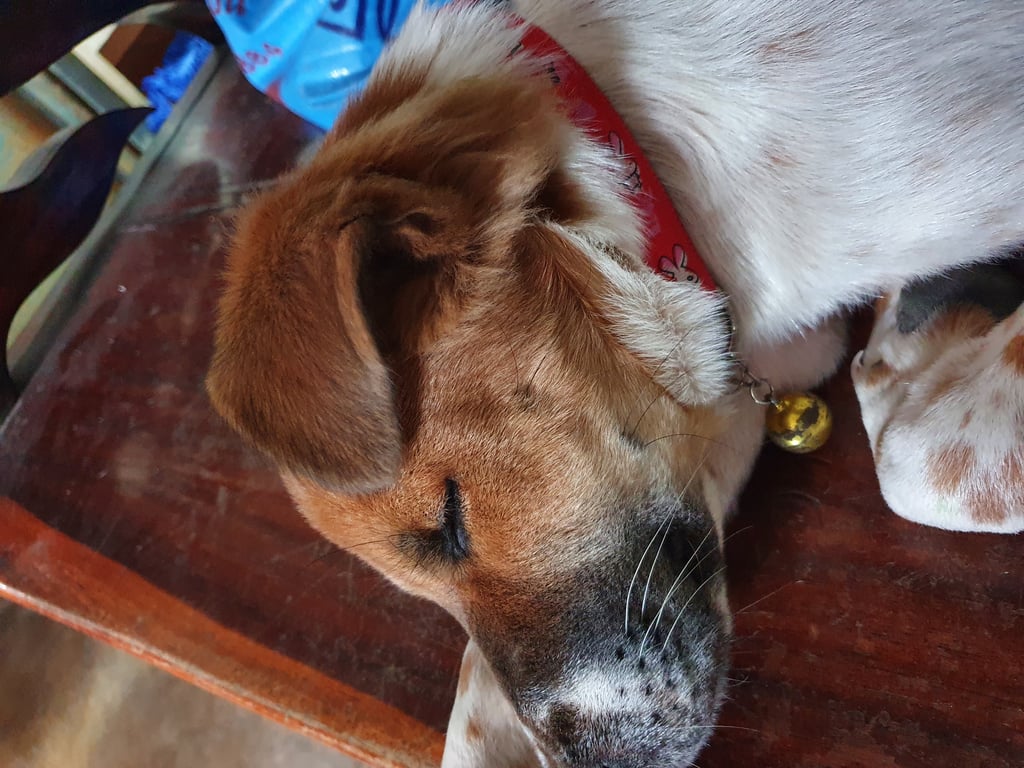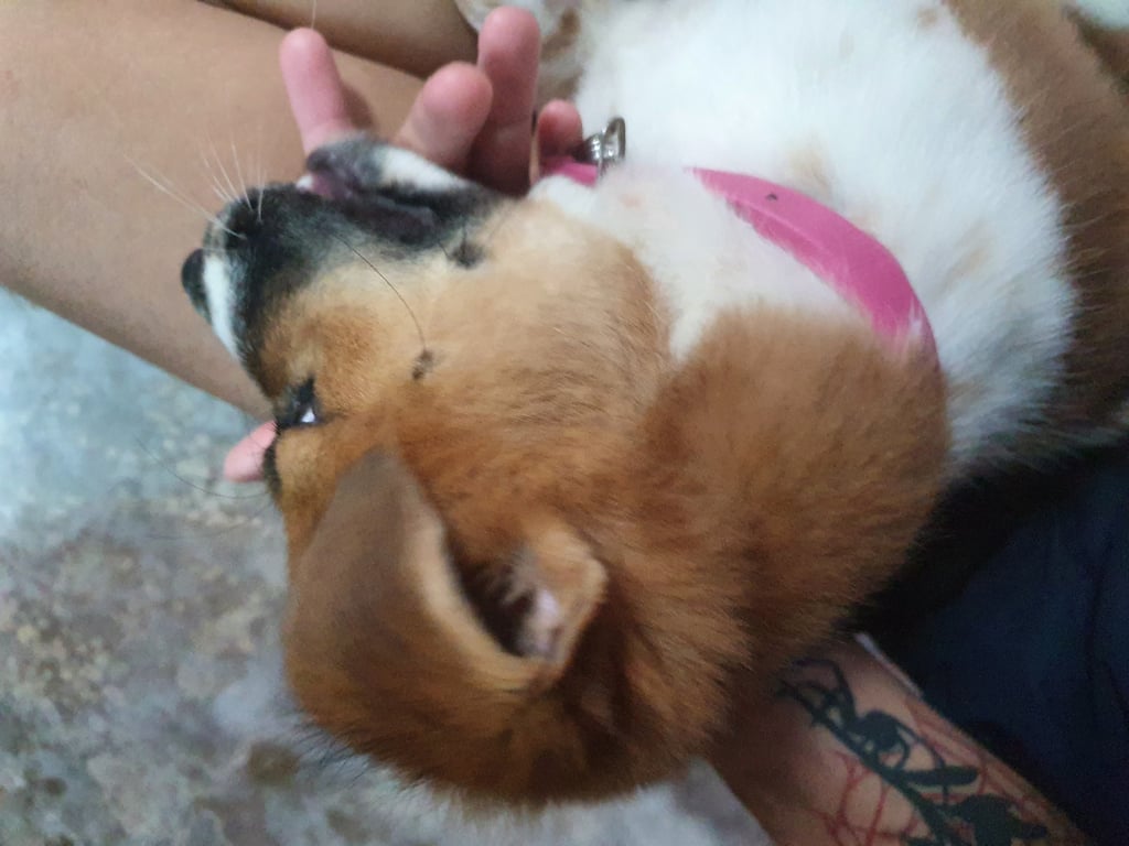 รอยตำหนิ: มีจุดดำข้างแก้มสองข้าง ตอนนี้ใส่ปลอกคอสีชมพูขี้กลัว ไม่กล้ากัดกับใคร เก่งแต่ในรั้วบ้าน