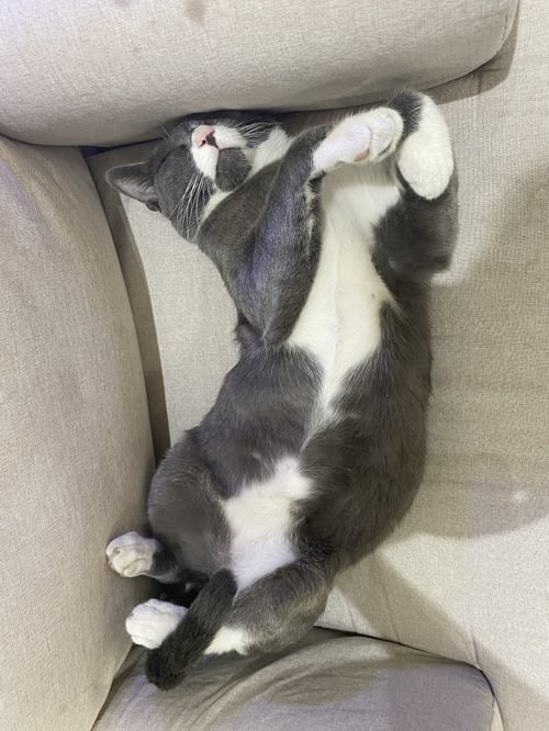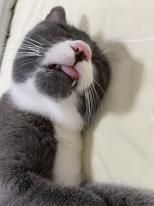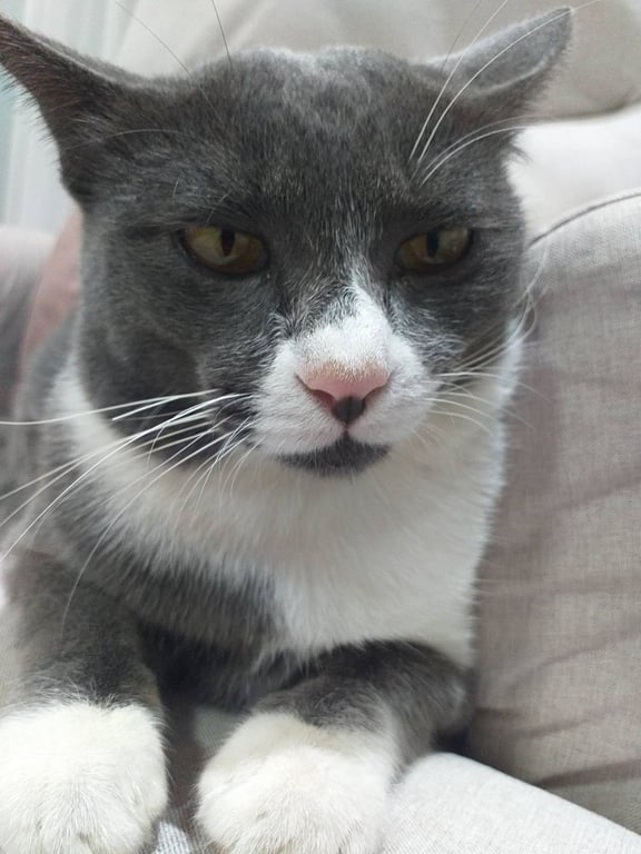 รอยตำหนิ: หูขวามีรอยแหว่งมีลายถุงเท้าสีขวา ทั้ง 4 เท้า เข้ากับคนง่าย กินจุ