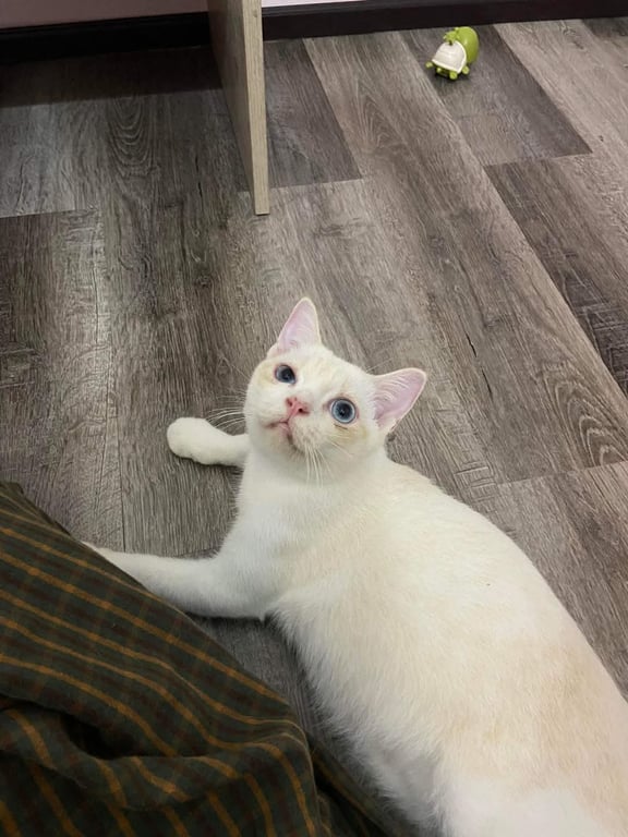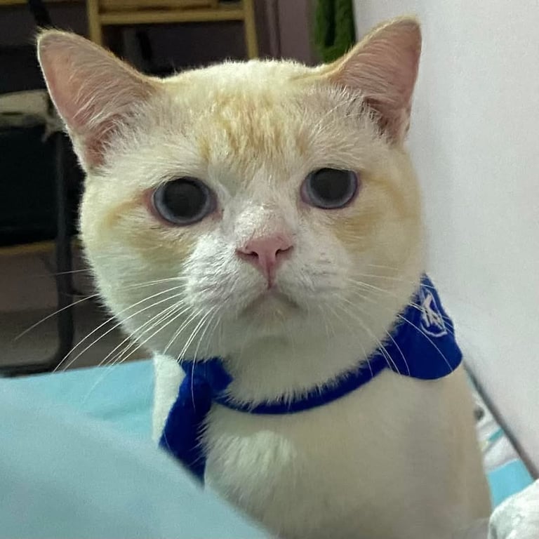 รอยตำหนิ: ขนสีขาวแกมส้ม หน้าผากสีส้ม หน้ากลม ตาสีฟ้าสว่าง ขาขวางอเข้าหาลำตัว