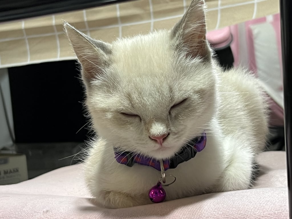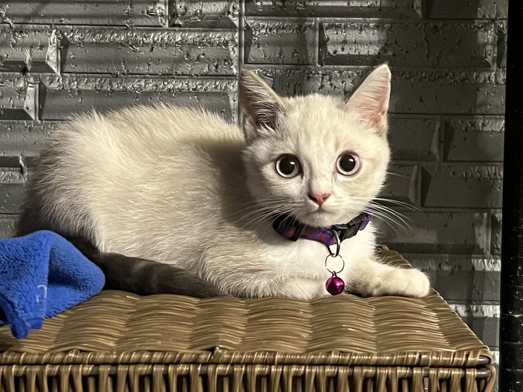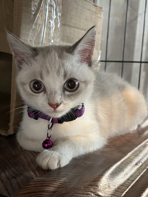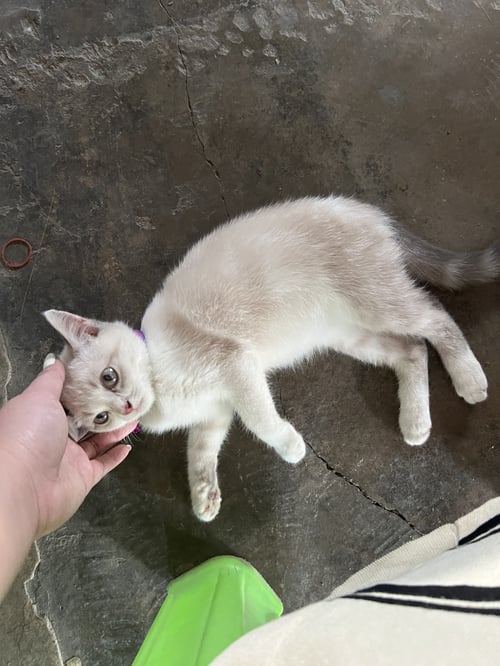 รอยตำหนิ: หูและหางสีดำอ่อนแมวอายุประมาณ 3 เดือน ปลอกคอสีม่วง